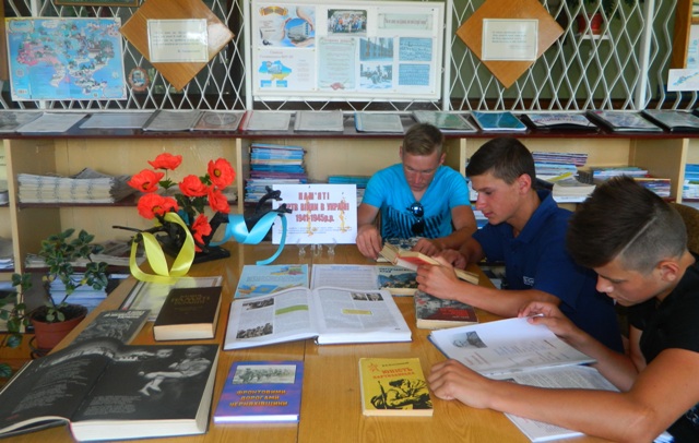 І пішли мільйони ні в чому невинних, але мужніх, хоробрих, відчайдушних українців, в серцях котрих горів яскравий вогонь патріотизму, захищати свою рідну землю. Крізь біль і сльози, голод і холод вони вперто йшли до перемоги, не впали на коліна перед грізним ворогом. В читальній залі бібліотеки училища оформлено книжкову викладку «Україна у другій світовій війні»