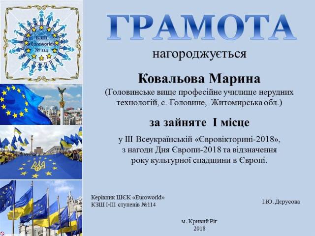 З метою підвищення професійного рівня та педагогічної майстерності викладач історії ГВПУ НТ Ковальова М. П. взяла участь в ІІІ Всеукраїнській «Євровікторині - 2018». Вікторина була проведена шкільним євроклубом «Euroworld» Криворізької загальноосвітньої школи І-ІІІ ступенів №114 в рамках святкування Дня Європи в Україні. Темою вікторини стала «Культура», адже 2018 рік проголошено Роком культурної спадщини в Європі.