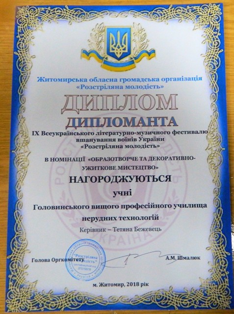 Творча група ГВПУ НТ відвідала літературно-мистецький фестиваль", де представила виставку матеріалів проекту "Ніхто крім них" (керівник бібліотекар Бежевець Т.П.) та експозиції, присвячені вшануванню пам'яті героїв Небесної Сотні, учасників бойових дій на Сході України та пам'яті загиблих в АТО випускників училища. На сцені драматичного театру Головинське ВПУ НТ представляла керівник гуртка навчального закладу Вікторія Мангуш.