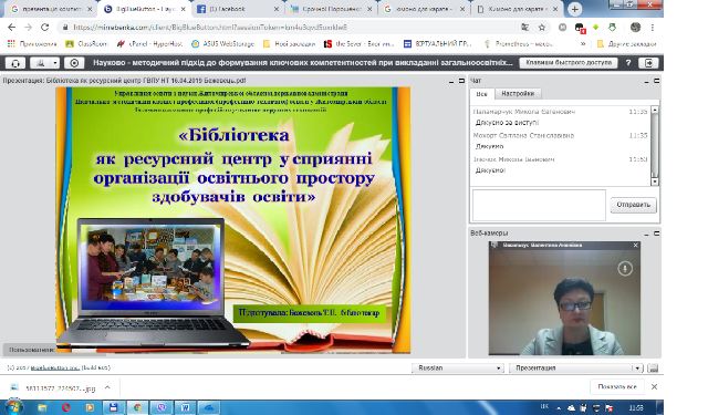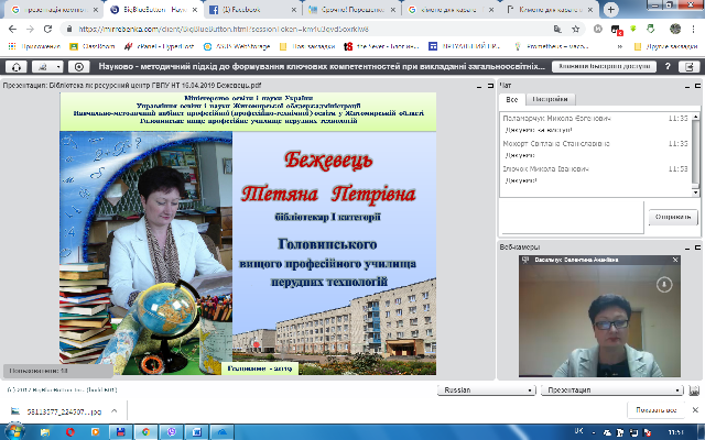 У вебінарі взяла участь бібліотекар Головинського ВПУ НТ, яка ознайомила учасників з роботою бібліотеки як інформаційно-ресурсного центру сприяння організації освітнього простору майбутніх фахівців.