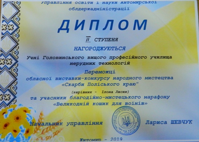 Колектив Головинського ВПУ НТ долучився до благодійно-мистецького марафону «Великодній кошик для воїна ООС», завершальний етап якого проходив 18 квітня 2019 року в обласній науковій бібліотеці ім. Олега Ольжича у м. Житомирі