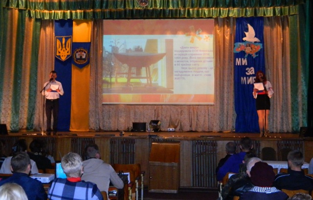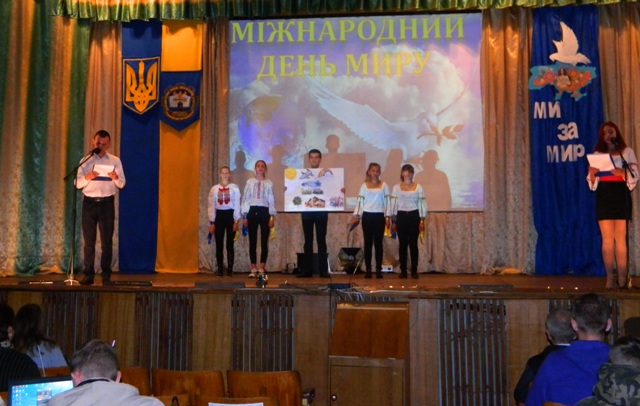Для багатьох людей у сучасному світі слово МИР стало казковою мрією, адже у різних куточках землі час від часу виникають збройні конфлікти, терористичні акти, прояви насильства та нетерпимості. Тому і було проголошено Міжнародний День миру, який щорічно відзначається 21 вересня. Саме до цієї важливої дати в актовій залі училища був проведений тематичний захід «Дзвін Миру». Ведучі розповіли присутнім про традиції відзначення цього Дня та змусили кожного задуматись над важливістю миру в цілому світі, у рідній державі та у власній душі.