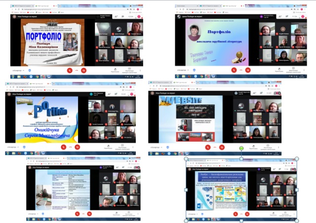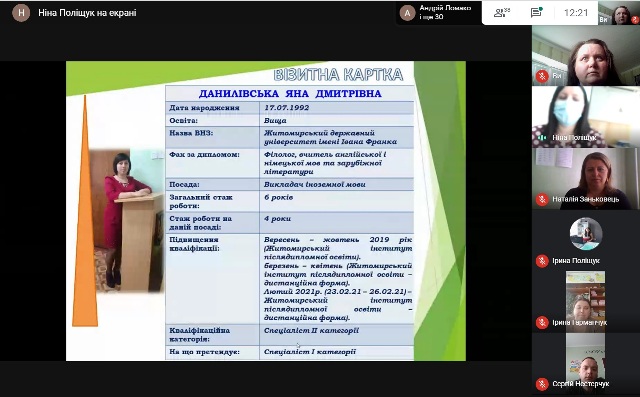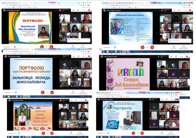 Педагогічні працівники, що атестуються в 2021 році, презентували свої електронні портфоліо та методичні надбання. Під час проведення засідання до виступаючих ставилися питання щодо організації ними освітнього процесу. Пріоритетними були запитання про джерела формування навчальних матеріалів, про організацію проведення власних уроків за умов карантину тощо.