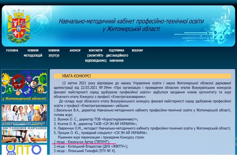У ІІ етапі Всеукраїнського конкурсу фахової майстерності серед здобувачів професійної (професійно-технічної) освіти Житомирщини з професії «Електрогазозварник» перемогу виборов Кисельчук Артур – здобувач освіти Головинського вищого професійного училища нерудних технологій.
