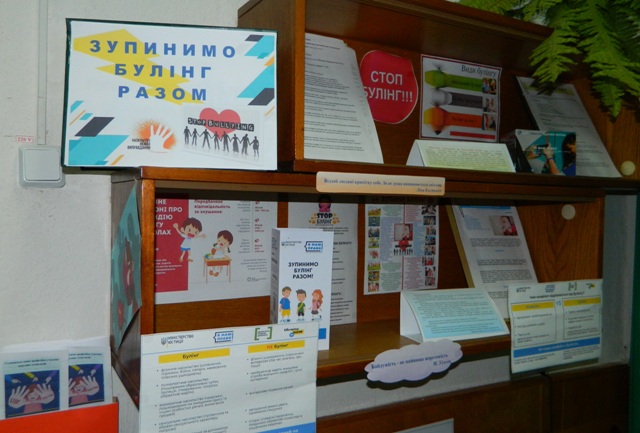 Бібліотекарем Бежевець Т.П. підготовлено інформаційну викладку «Зупинимо булінг разом» та розроблено буклет для інформаційно-просвітницьких годин у навчальних групах. У фоє навчального корпусу училища протягом тижня встановлена скринька «Відверто про наболіле».