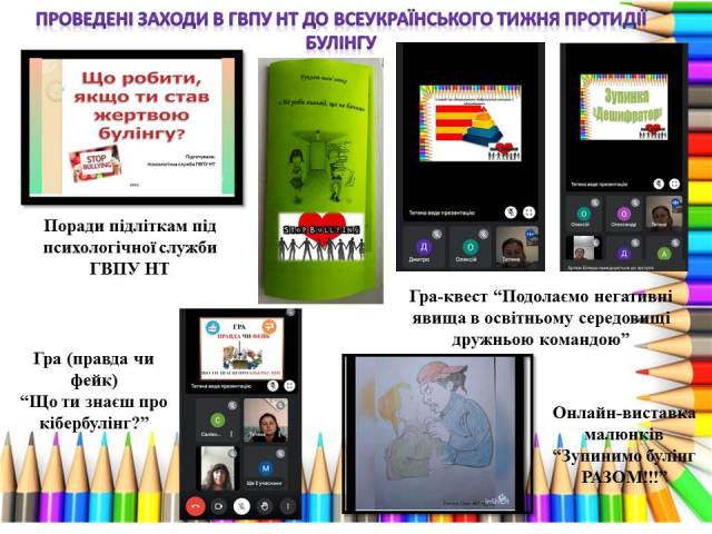 У цілях інформування здобувачів освіти щодо проблеми булінгу психологічною службою ГВПУ НТ було розроблено та розповсюджено буклет-пам’ятку «Не роби вигляд, що не бачиш» та підготовлено відеоповідомлення «Що робити, якщо ти став жертвою булінгу?»