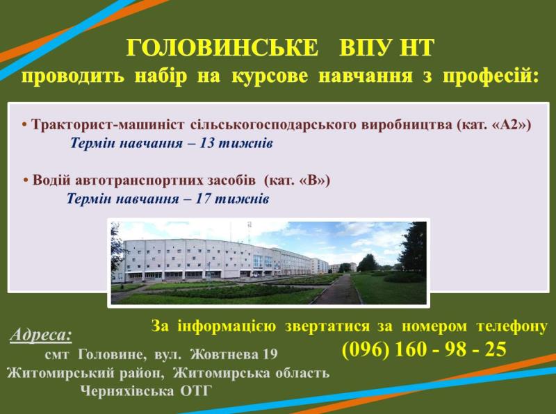 - «Водій автотранспортних засобів, категорія «В» в кількості 30 чол. з терміном навчання 17 тижнів, вартість навчання 7 500 грн.